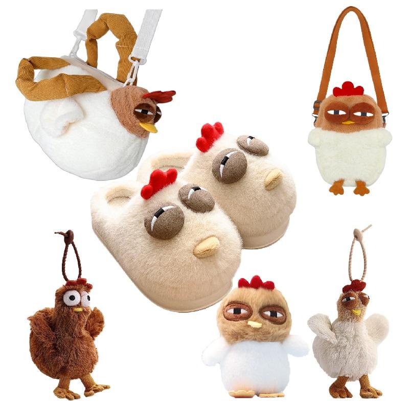 Jouets Peluches Forme Poulet Moche Poule Peluche Sac à Main Mignon Pendentif Poulet Porte-clés Poupée Sacoche Portefeuille pour Femmes Pantoufles Maison
