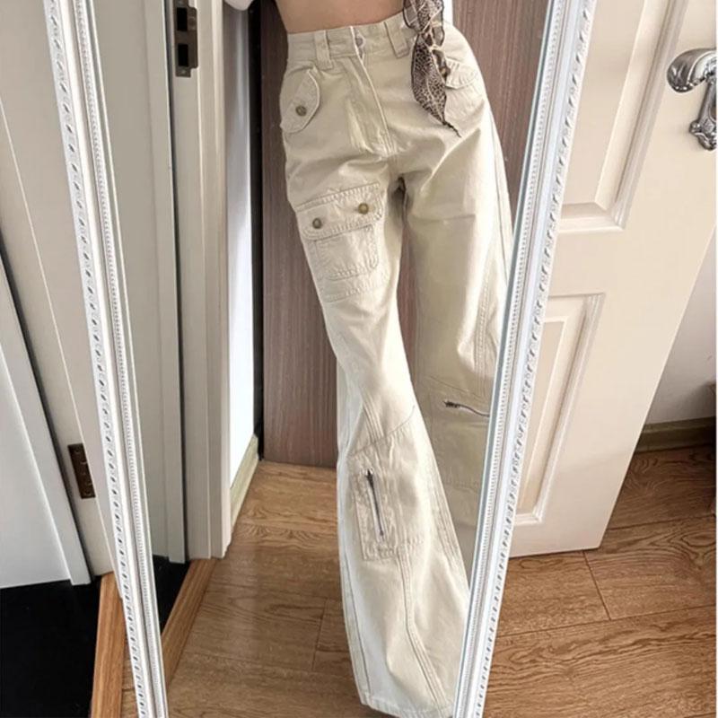 Jeans Cargo Taille Haute pour Femme Beige Jambe Large Pantalon en Denim avec Poches