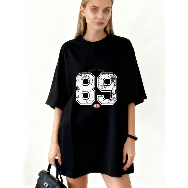T-shirt Oversize Noir Numéro 89 Division Athlétique Imprimé Streetwear Décontracté Top Mode Pour Femmes