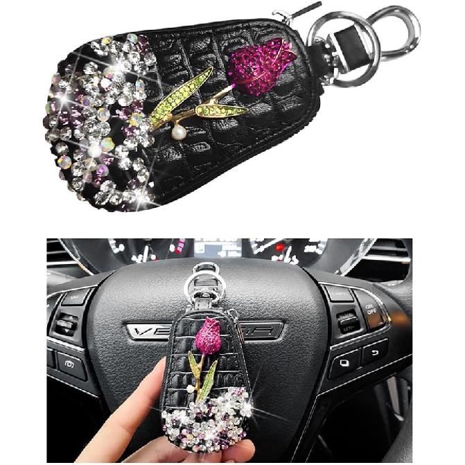 Mandark Bling Car Key Case, Leather Crystal Rhinestone Vehicle Key Fob Protector, Automotive Smart Keychain Holder for Remote Key Fob, Universal