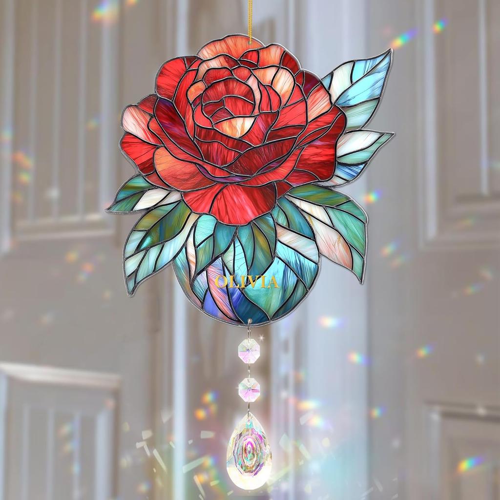 Rose Suncatcher - Birth Flower Gifts for Women, Birth Flower with Name Suncatcher Ornament with Crystal, for Mom, Grandma