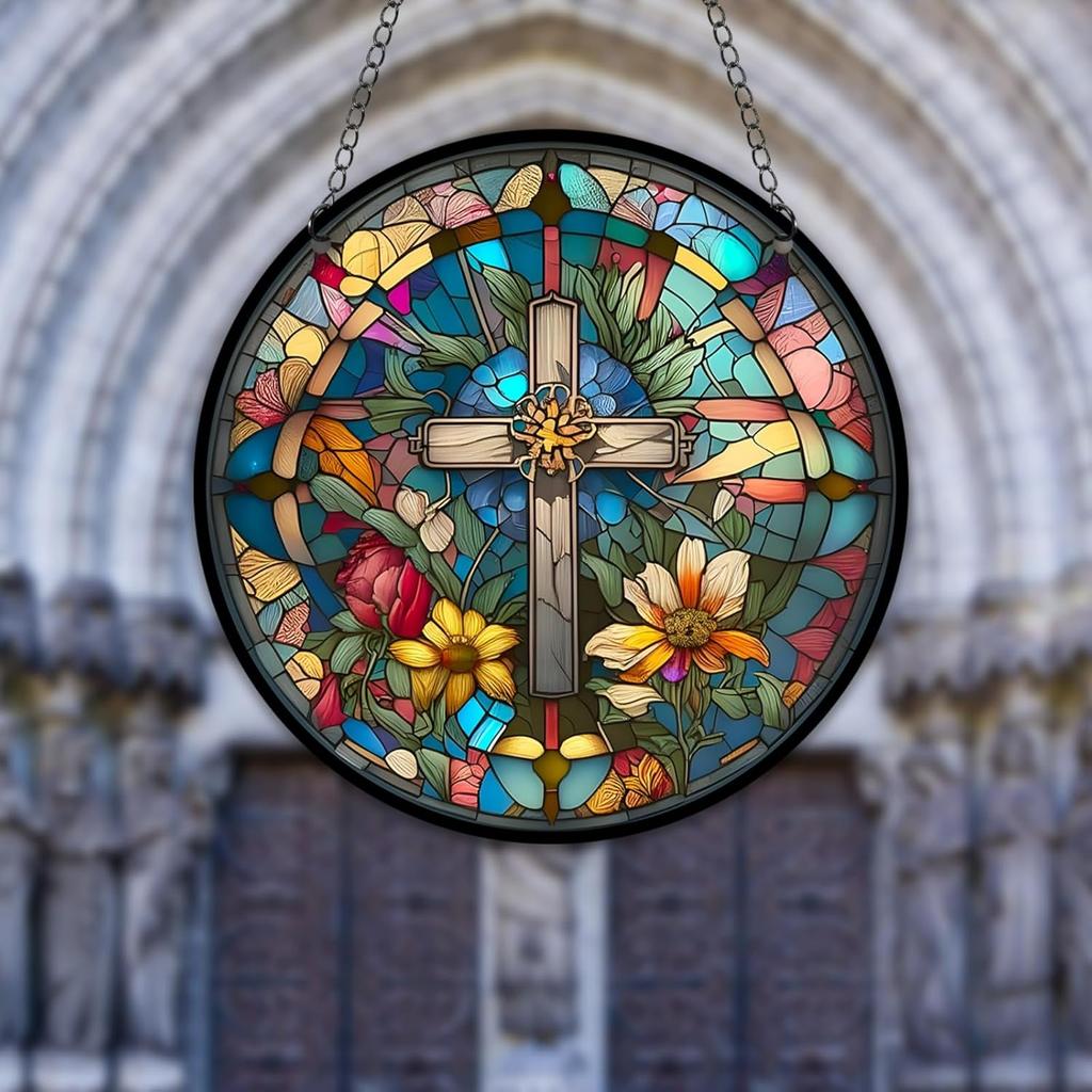 HOTIYOK God Bless Acrylic Window Hanging Vintage Cross Stained Wall Decor, Ideal Housewarming Gift, Home Decor for Mom Grandma Wife Teacher