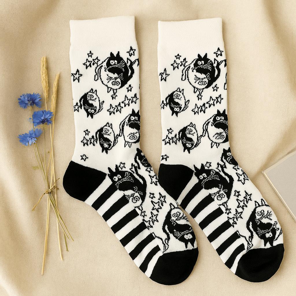 Tricotés dans un mélange riche en bambou, ils sont doux et délicats pour la peau, avec une légère élasticité qui épouse sans serrer.. Le tissu respirant aide à gérer l'humidité et garde les pieds confortablement au chaud et soignés, tandis que la couture plate au niveau des orteils et le revers stable réduisent les frottements et les distractions.. Un motif noir sur blanc à fort contraste — des chats et de minuscules étoiles au-dessus, des rayures nettes sous les pieds, avec un talon et un bout noirs unis — ajoute un clin d'œil discret aux tenues de tous les jours et aux moments douillets à la maison.