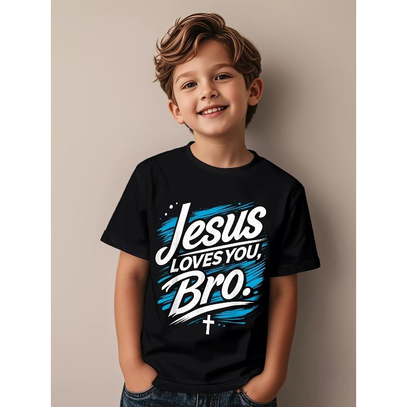 European sizes Jesus Loves You Bro Boys Christian T-Shirt - Religious Kids Tee with Message, Short Sleeve Casual Wear for Church, Sunday,