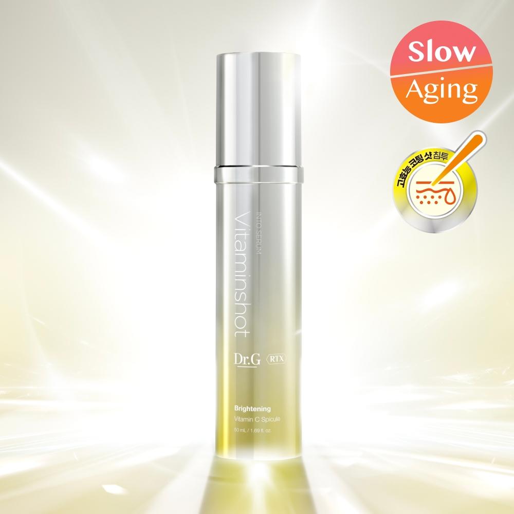 Dr.G RTX Into Serum Vitamin Shot 50ml is a functional serum that helps with whitening and wrinkle improvement. The high-concentration spicule technology allows Aero Spicule TM, which is three times longer than the skin's stratum corneum, to penetrate deep into the skin, assisting in the rapid absorption of effective ingredients and providing immediate skin changes. This product, boosted with pure vitamin C, helps improve dull skin, while the vitamin E exosomes, crushed to 1/2600 of the pore size, ensure quick delivery of vitamin E without ingredient loss. The serum texture provides a subtle transparent glow upon application and can be used hygienically due to its pump type.