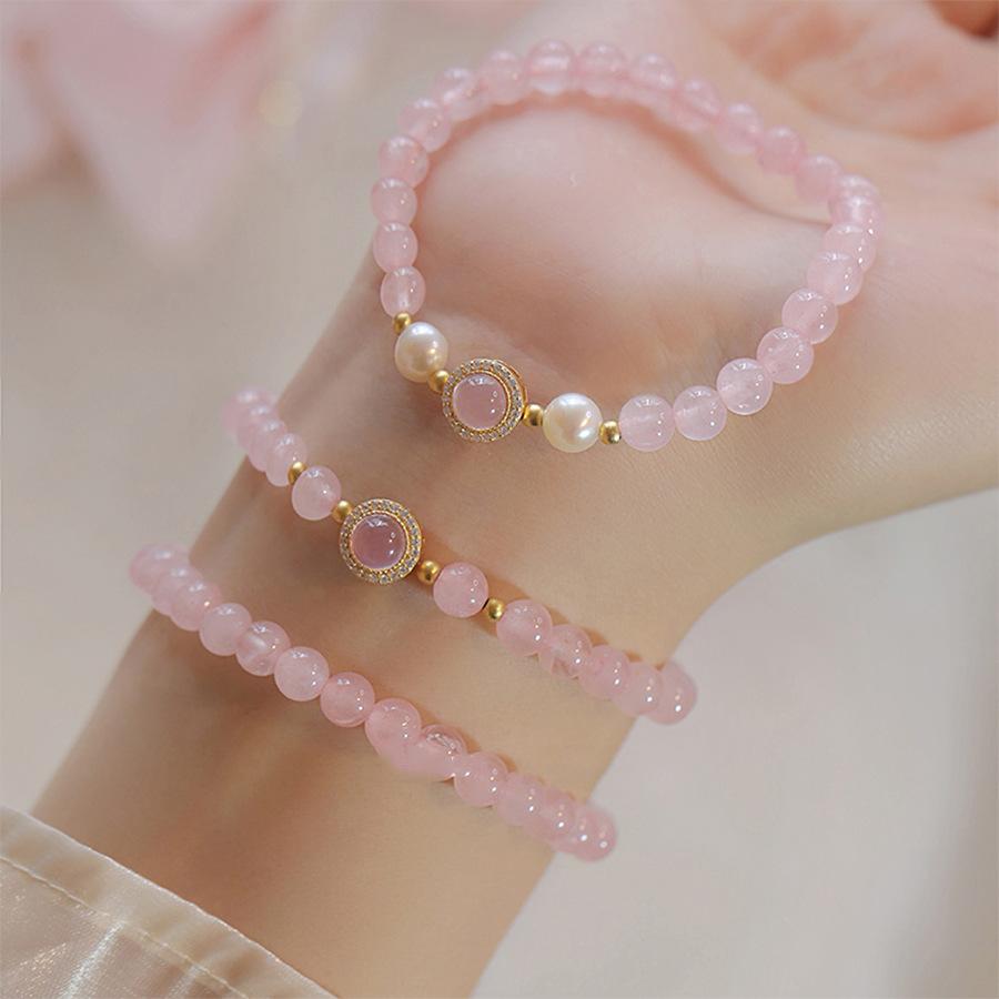 Bracelet en cristal de poudre de calcédoine perle d'eau douce bracelet en cristal breloque féminine fleur de pêcher cœur de fille frais, doux et à la mode