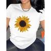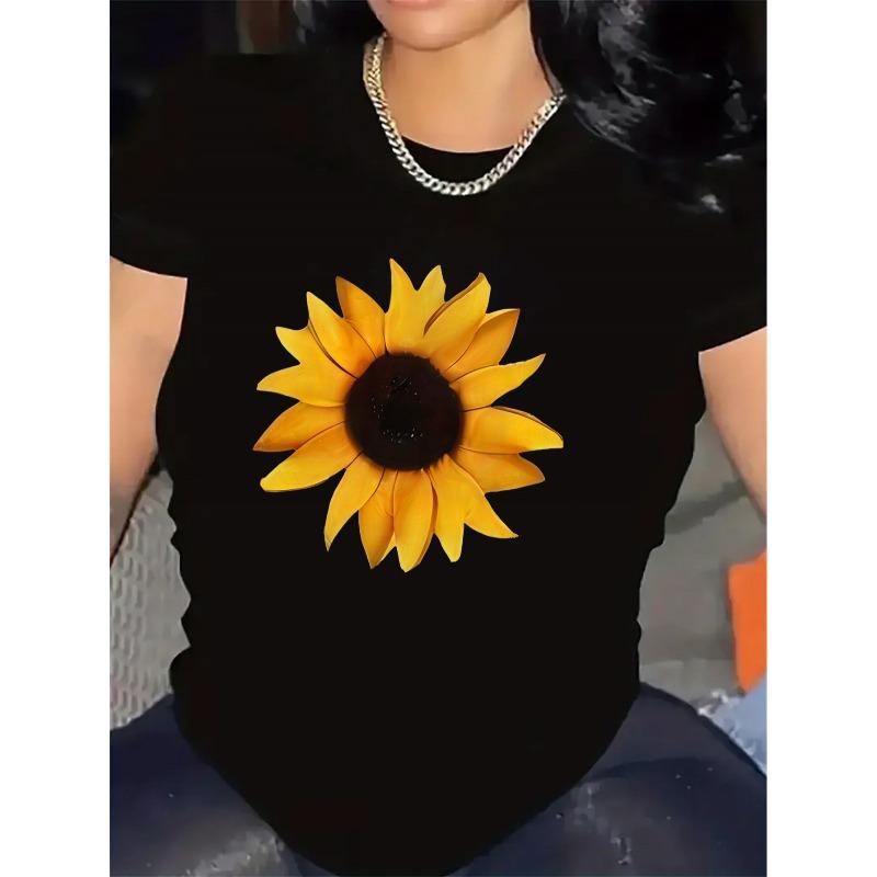 T-shirt pour femme Noir Blanc Imprimé Tournesol Manches Courtes Col Rond Blouse Décontractée Tissu Extensible Moyen Lavable en Machine