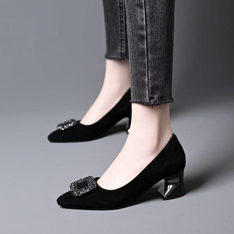 Escarpins noirs haut de gamme à bout pointu et décolleté peu profond, ornés de strass. Nouveaux escarpins d'automne à talon mi-haut, résistants et de qualité supérieure.