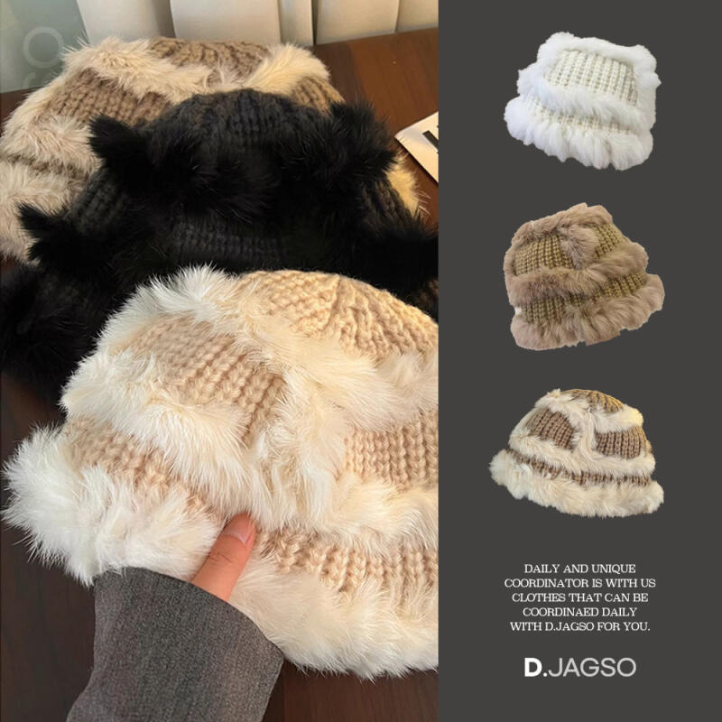 Bonnet bob d'hiver pour femme en maille mélangée fourrure de lapin