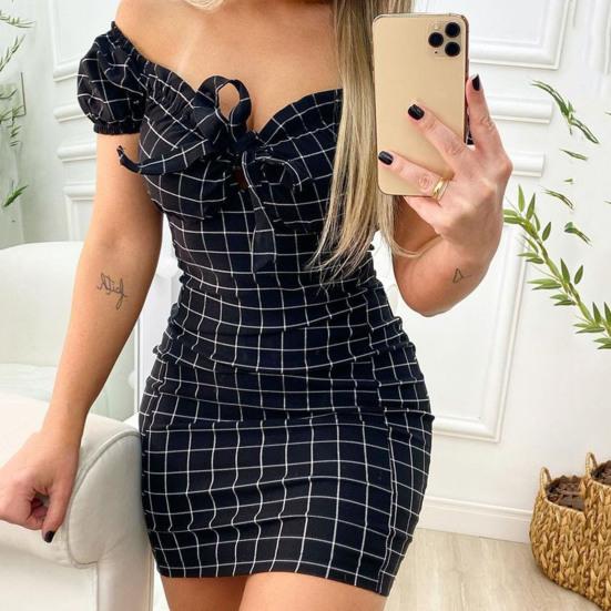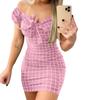 Robe Mini Slim Décor Nœud Papillon Doux Imprimé Carreaux Épaules Dénudées Robe Bodycon Vêtements Féminins
