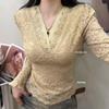 T-shirt de base en dentelle à manches longues et col en V ajusté pour femme 2025