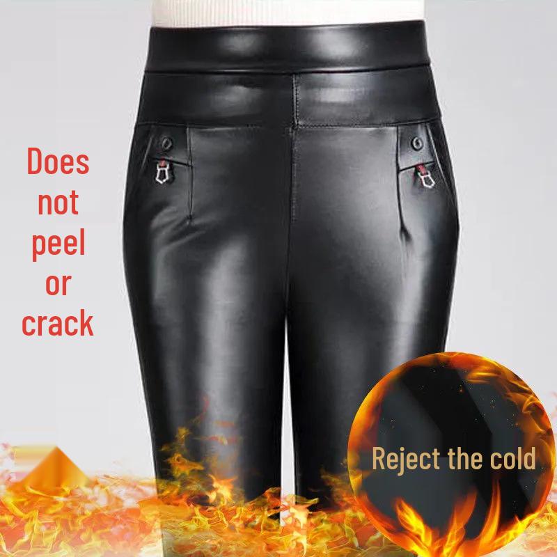 Mom's High-Waisted Leather Pants: Winter Plus Velvet Straight-Leg Style for Middle-Aged & Elderly Women