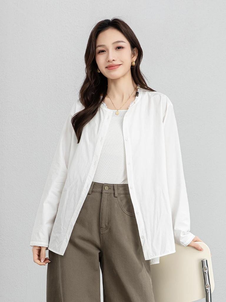 Xin Ge Cotton Loose Casual Long Sleeve Shirt with Beaded Collar