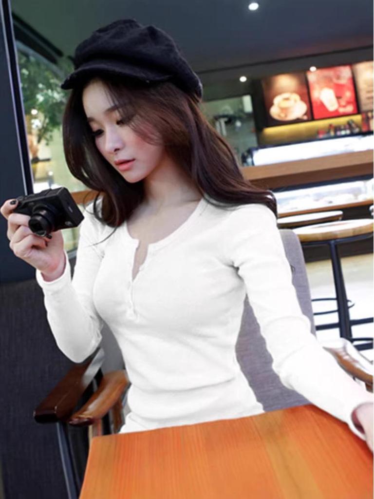 Ce T-shirt Boutonné Manches Longues Coupe Ajustée pour Femme est un ajout polyvalent à votre garde-robe, parfait pour le printemps comme pour l'automne.. Fabriqué en polyester de haute qualité, ce haut élégant présente un motif uni et un décolleté en V flatteur.. Les manches longues offrent un look sophistiqué, tandis que la coupe ajustée ajoute une touche d'élégance.. Inspiré du style coréen contemporain, ce t-shirt allie sans effort confort et mode, en faisant un indispensable pour toute tenue saisonnière.