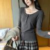 Gentle White Henley Base Layer Women's Slim-Fit Long-Sleeve T-Shirt for Autumn/Winter, New Korean Style.
