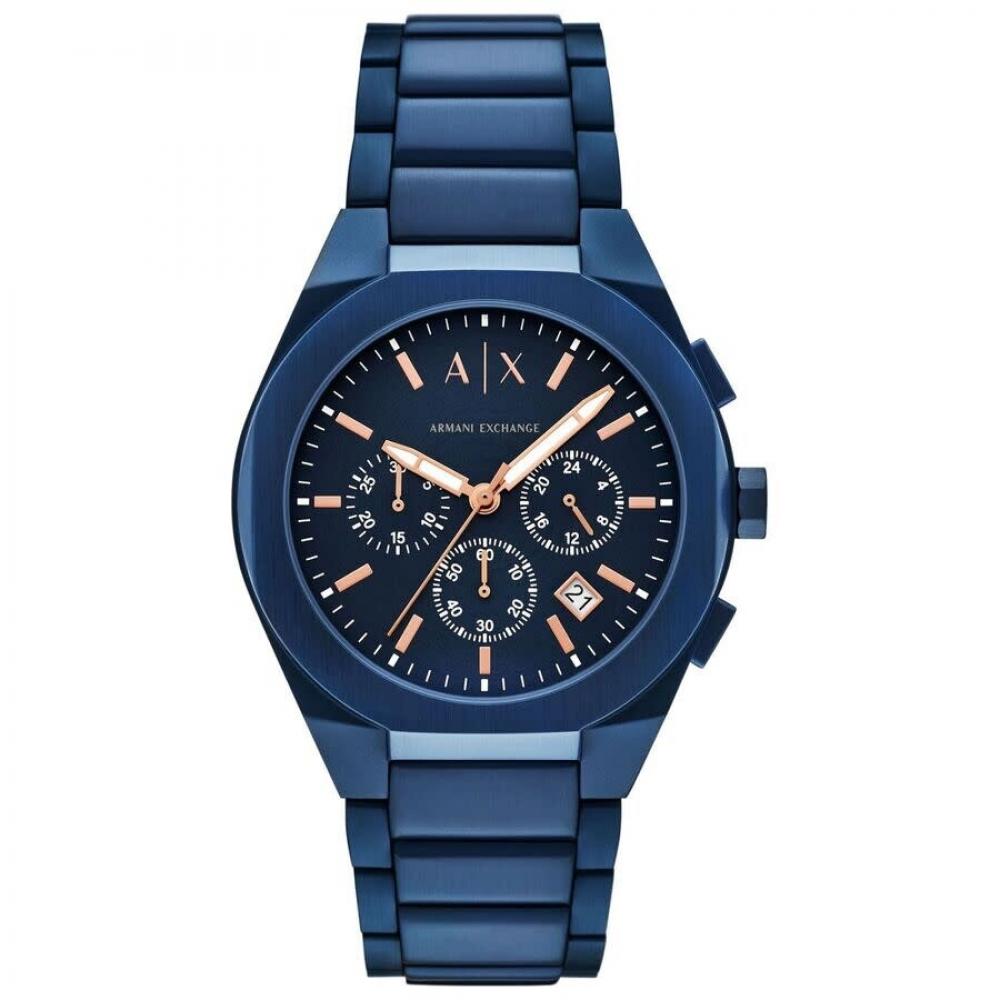 Blue stainless steel case and bracelet. Fixed blue stainless steel bezel. Blue dial with rose gold-tone hands and index hour markers. Minute markers around the outer rim. Dial Type: Analog. Date display between 4 and 5 o'clock position. Quartz movement. Scratch resistant mineral crystal. Round case shape, case size: 42 mm, case thickness: 11 mm. Band width: 22 mm, band length: 7.5 inches. Fold over clasp. Water resistant at 50 meters / 165 feet. Functions: chronograph, date, hour, minute, second. Sync Series. Fashion watch style. Armani Exchange Sync Chronograph Quartz Blue Dial Men's Watch AX4189.
