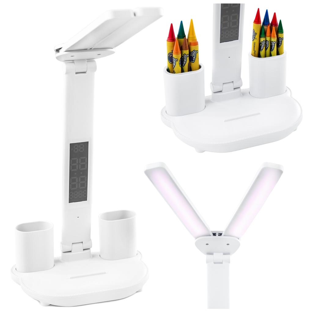LED DESK LAMP WITH DISPLAY DESK LAMP CLOCK TEMPERATURE TOUCH Do you struggle with insufficient lighting while working or studying? Do your eyes tire easily in artificial light? Or maybe your desk is chaotic and you lack space for pens, phone, or notes? We have the perfect solution for you! This multifunctional LED desk lamp with clock, temperature, and organizer is a must-have for every woman who values style, comfort, and functionality. It provides ideal lighting for work, studying, or relaxing, and thanks to the built-in phone stand and organizer, everything is within reach! LIGHT ADJUSTMENT – PERFECT LIGHTING FOR ANY OCCASION Thanks to three light colors (warm, cool, neutral) you can adapt the lighting to your needs. Whether you're reading a book, working on the computer, painting your nails or studying – you can adjust the brightness and angle to ensure maximum comfort. The lamp produces natural light that is safe for the eyes and does not cause eye strain. The LEDs do not heat up, which makes the lamp safe even for children. SMART LCD DISPLAY – YOU HAVE EVERYTHING UNDER CONTROL! The lamp does more than just shine! The clear LCD display shows the time, date, and temperature, so you always know what time of day and room conditions it is. No more searching for your watch or checking the temperature on your phone – now you have all the information in one place in ! Backlit LCD display in black shows information such as: 1⃣ temperature (Celsius scale) 2⃣ time 3⃣ date TOUCH CONTROL AND ADJUSTABLE ANGLE AND LIGHT! Forget about awkward buttons! The touch switch and color temperature adjustment make operating the lamp intuitive and quick. Additionally, you can adjust the angle to tailor the light to your needs – perfect for working, studying, reading, or precision tasks like applying makeup or painting nails! The lamp is equipped with two independent light arms, which you can combine to focus the light in one place , ideal for precise tasks such as reading or working at a desk. If you need wider lighting, just spread it to evenly disperse the light and illuminate a larger area – perfect when studying, drawing or working in a larger area! DESK ORGANIZER – NO MORE CLUTTER! Is your desk in chaos? Two special slots for pens, scissors, sticky notes, and other small items will help you stay organized! Now you have everything in one place, and your desk looks neat and elegant. BUILT-IN PHONE AND TABLET STAND – CONVENIENCE AT YOUR FINGERTIPS Watching movies, video calls, or using apps has never been so convenient! The built-in phone and tablet stand allows for their stable positioning, so you don't have to hold the device in your hand or support it with random objects. ENERGY SAVING AND UNIVERSAL POWER SUPPLY – CONNECT TO A COMPUTER OR CHARGER! The lamp is equipped with a USB-C cable, which you can connect to a computer, powerbank or charger. Thanks to LED technology, it is energy-saving and ecological, consuming a minimal amount of electricity. IDEAL AS A GIFT – STYLE AND FUNCTIONALITY IN ONE! Are you looking for a practical and elegant gift? This lamp is a bull's-eye! Perfect for birthdays, Women's Day, Valentine's Day, Boy's Day, as well as for students. will work well in the office, children's room, living room, garage, and even as additional makeup lighting! SET CONTENTS lamp USB power cable 2 organizers cardboard packaging SPECIFICATION color: white height: 31 cm power: 7 W material: ABS power supply: USB-C (cable included) cable length: 100 cm color temperature: 3000-6000 K (warm, cold, neutral) number of LEDs: 40 switch: touch additional functions: clock, temperature, date, organizer, phone holder