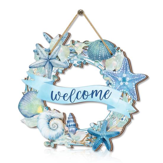 Panneau de Porte Étoile de Mer Coquillages Design Aquarelle Bois Décor Plage avec Corde de Suspension Imperméable Extérieur Intérieur Panneau Entrée Bord de Mer Accent Maison