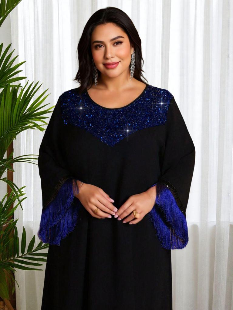 This elegant long dress is designed with a sophisticated Islamic style, featuring a stunning royal blue shade enhanced with sequin patchwork. The dress is crafted from high-quality polyester, ensuring comfort and durability. It boasts long sleeves adorned with tassel cuffs, adding a touch of flair to its design. The round neckline complements the loose waistline, providing a flattering and comfortable fit. Perfect for special occasions, this dress offers a blend of modesty and glamour.