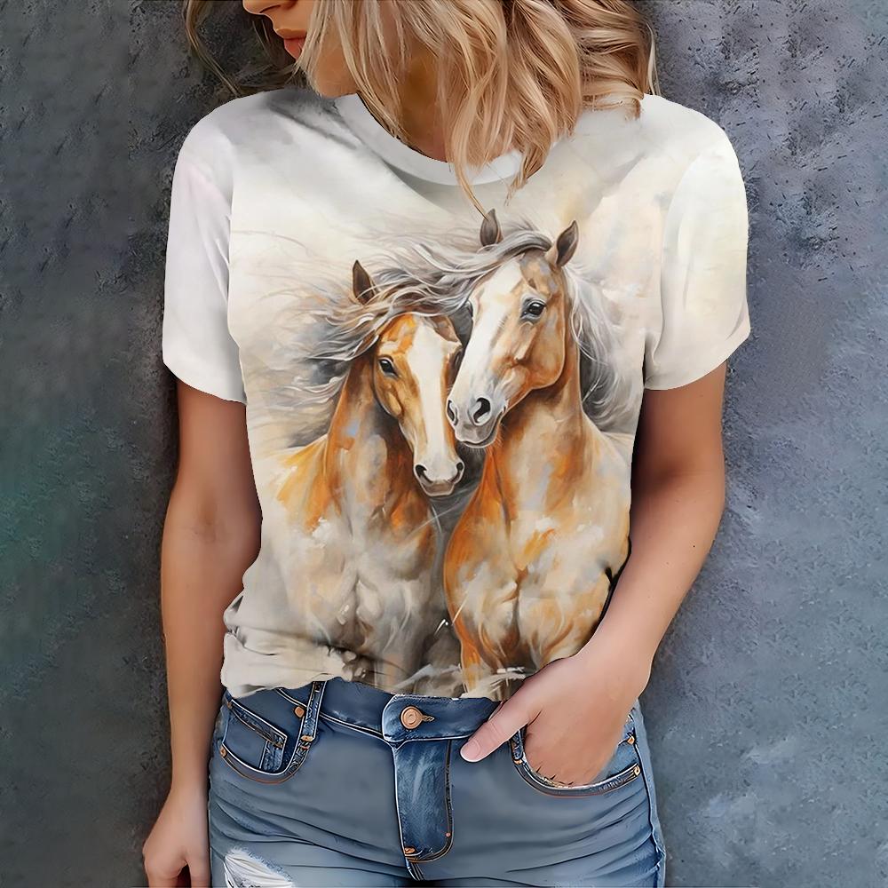 Women's Summer Elegant Fashion T-shirt Women's Popular Casual Comfortable Elegant Steed 3D Printed Short Sleeve Top