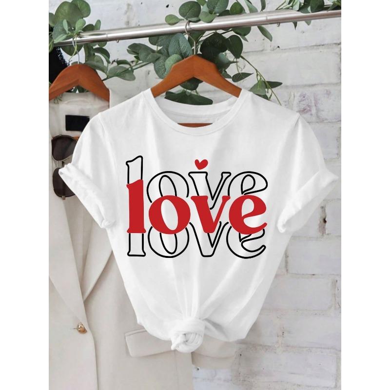 T-shirt Blanc & Rouge Imprimé Cœur LOVE pour Femme Décontracté Col Rond Manches Courtes Printemps Été Saint-Valentin Haut