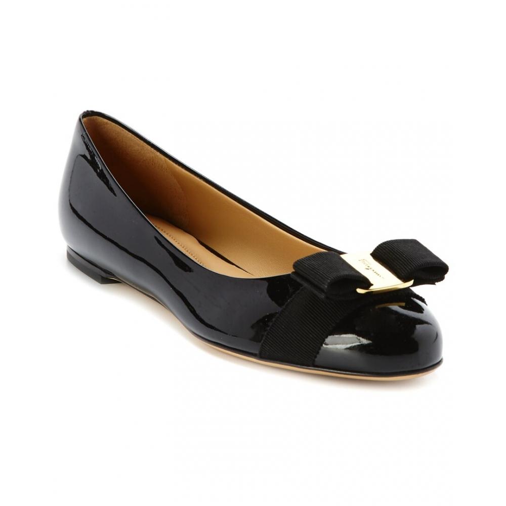 Elevate your shoe collection with the timeless elegance of the Ferragamo Varina Patent Ballet Flat from Salvatore Ferragamo. This classic wardrobe essential features the iconic grosgrain Vara bow and signature plate, making it a must-have for any fashion-forward woman. Crafted in Italy from luxe black patent leather, this ballet flat is adorned with gold-tone hardware and a grosgrain Vara bow accent for a touch of sophistication. The lightly padded leather insole and smooth leather sole ensure all-day comfort, while the approximate .25 inch heel adds a subtle boost of height. Please note that sizing options include AA for narrow, B for standard, C for wide, D for extra wide, and M for medium. Measurements were taken from a size 7 and may vary slightly by size. Rest assured that our products are 100% genuine, sourced from trusted independent suppliers to ensure authenticity. Add the Ferragamo Varina Patent Ballet Flat to your collection for a stylish and chic finishing touch to any ensemble.
