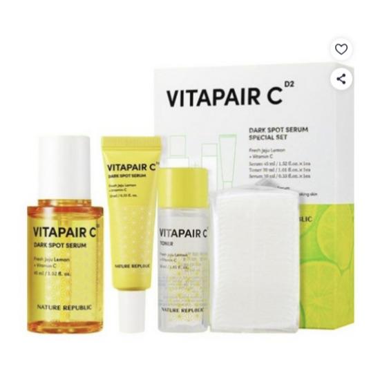 This special skincare set from NATURE REPUBLIC helps brighten dull skin and reduce the appearance of dark spots. Powered by the Vitapair C formula with Vitamin C and citrus ingredients, it supports clearer, more radiant skin. The lightweight serum absorbs quickly to improve skin tone and texture while delivering refreshing hydration. The set also includes a mini serum, toner, and cotton pads for a complete brightening routine.