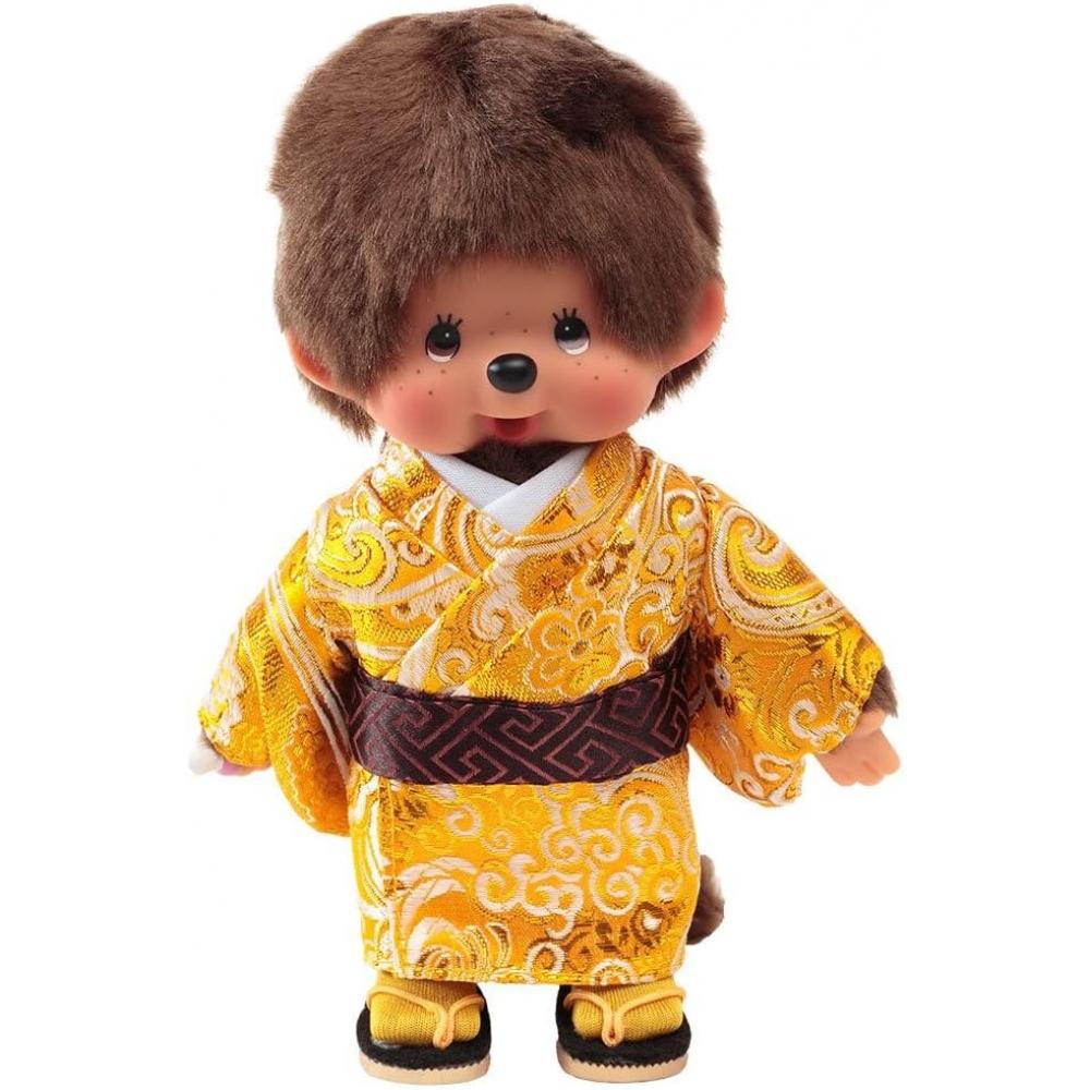 Le Kimono Monchichi Boy Kim IPM-80-Z Officiel Original Kukuzuki de Tokyo présente un personnage Monchichi vêtu d'une tenue japonaise traditionnelle, arborant un magnifique kimono doré.. Ce produit est conçu pour être autoportant, mettant en valeur son charme. Monchichi est un personnage japonais très apprécié qui a fait ses débuts en 1974 et a gagné l'amour du monde entier.