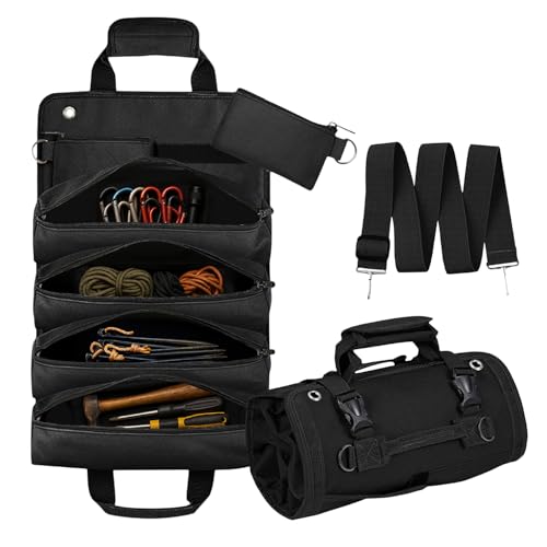 【High Organization Capacity】Five pockets + top pocket + two removable pouches for centralized storage of small items. Pegs, hammers, ropes, etc., can be organized by type, allowing for quick access to necessary tools. The removable pouches are convenient for use both in the car and in the field.