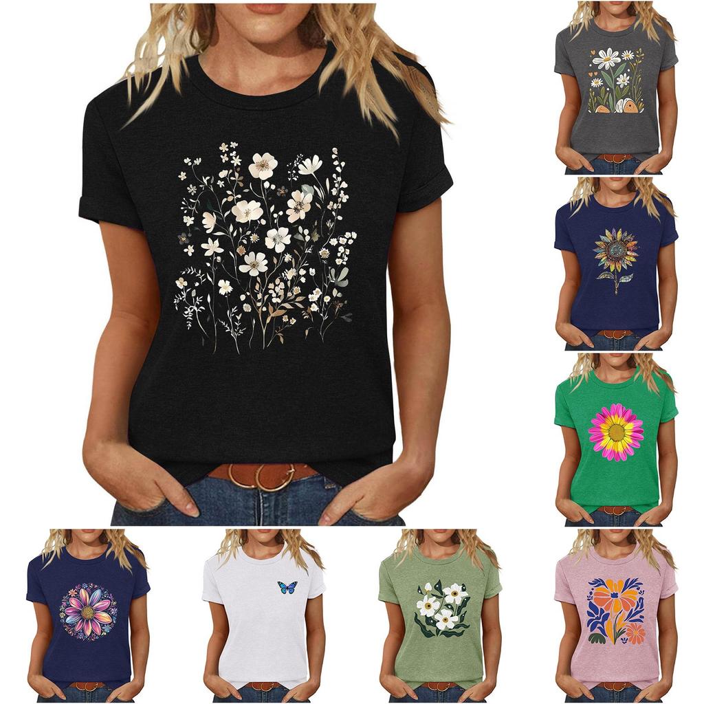 T-shirt Décontracté à Manches Courtes et Col Rond pour Femmes avec Imprimé Floral