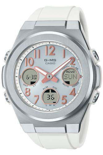 From the BABY-G G-MS (G-MIS) line for active and sophisticated women, this model incorporates highly legible Arabic numerals on the indexes. The base model is the radio-controlled solar model MSG-W600, a digital/analog combination model combining hour and minute hands and a digital window with a wide face design for easy viewing. Two colors are available: pink gold bezel and black band, and silver bezel and white band. The basic color lineup is sure to be a favorite all year round. In terms of functionality, the watch is equipped with reliable features such as Multi Band 6, which receives radio waves from six stations around the world and automatically corrects the time, world time, and Tough Solar. The G-MS is useful for both on-time and off-time activities, while maintaining the functions that are useful in active scenes.