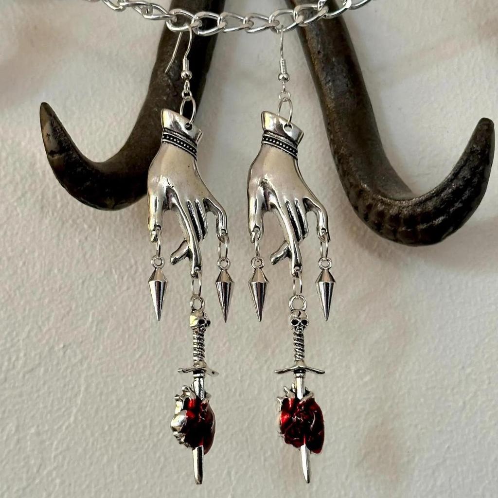 Gothic Sliver Color Hand Skull Sword Rivet Tassel Dangle Earrings for Women Halloween Party Demon Slayer Scary Jewelry Gifts