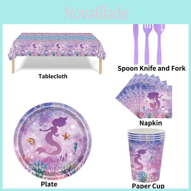 Make your child's birthday party unforgettable with this beautiful mermaid party supplies set!Featuring an enchanting mermaid design in dreamy pink and purple colors, this set includes everything you need for a festive celebration.The set includes 16 paper cups, 16 7-inch plates, 16 9-inch plates, 20 paper napkins, 16 purple cutlery pieces, and a tablecloth.The durable paper material ensures that this set is both high-quality and easy to dispose of after the event.Make your child's party dreams come true with this magical mermaid party supplies set!