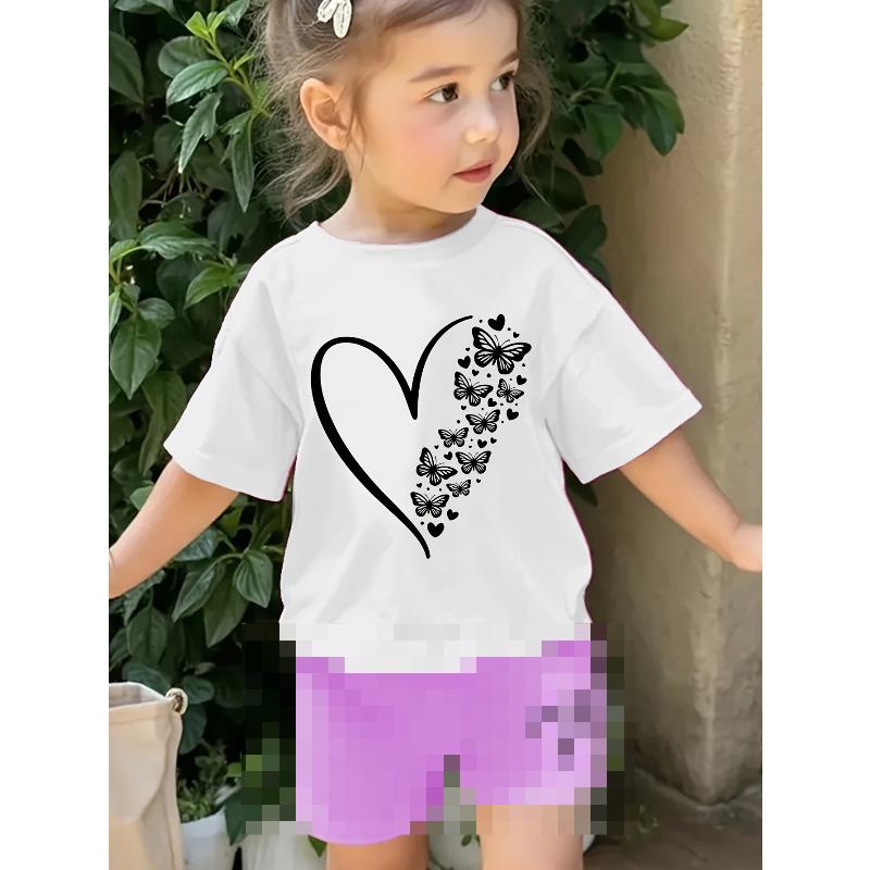 Tailles européennes Été Enfants Filles Cœur Papillon Imprimé Mode Décontracté T-shirt à Manches Courtes, Parfait pour l'Extérieur