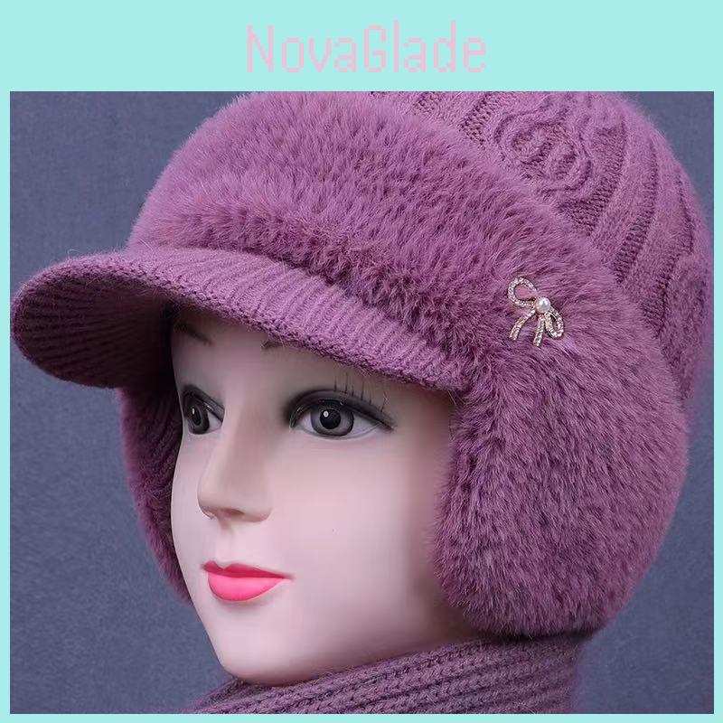 Knitted Earflap Hat For Seniors With Rhinestone Bow Decor For Autumn Winter