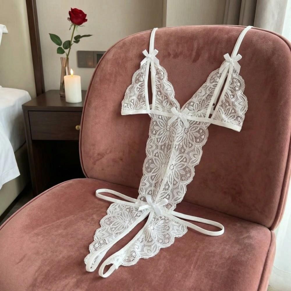Deep V Neck Lace Bow Bodysuit Transparent Lace Sling Nightwear Sweet Women Lingerie Ladies