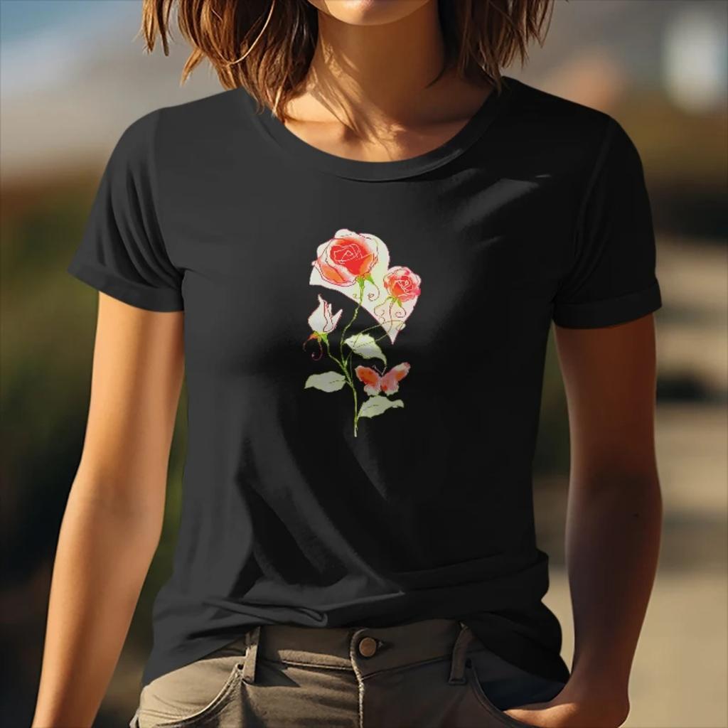 Summer Womens Short Sleeve Cotton T Shirt Rose and Butterfly Print for Casual Evenings Young Women with a Graceful Style