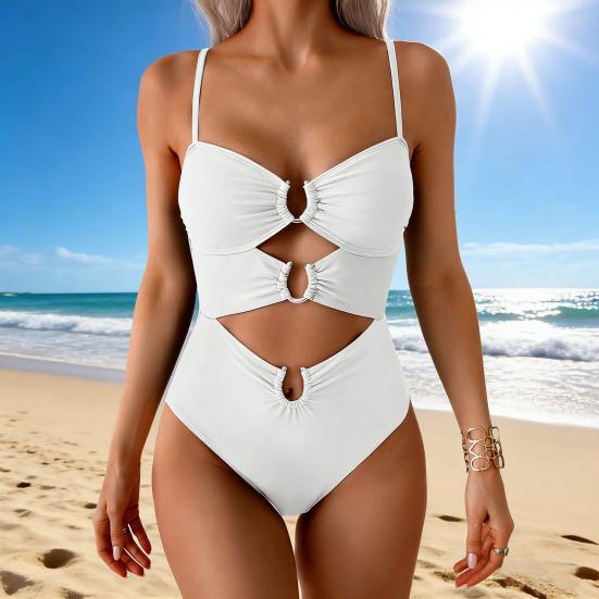 Ce monokini une pièce est doté d'un soutien-gorge push-up à armatures qui galbe et rehausse pour une silhouette flatteuse.. Conçu avec des boucles métalliques, il ajoute une touche d'attrait et de sophistication.. Le décolleté en V à bretelles et le dos nu de la robe créent un look épuré et minimaliste qui met en valeur vos courbes naturelles..