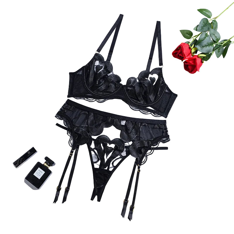 Lace Mesh Embroidery Lingerie Gathering Straps Three Piece Set Shaping Body Underwear