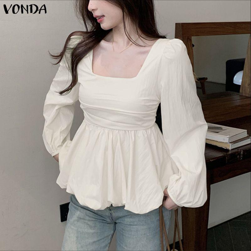 VONDA Womens Square Collar Long Sleeve Ruffled Casual Rumple Blouse Shirts