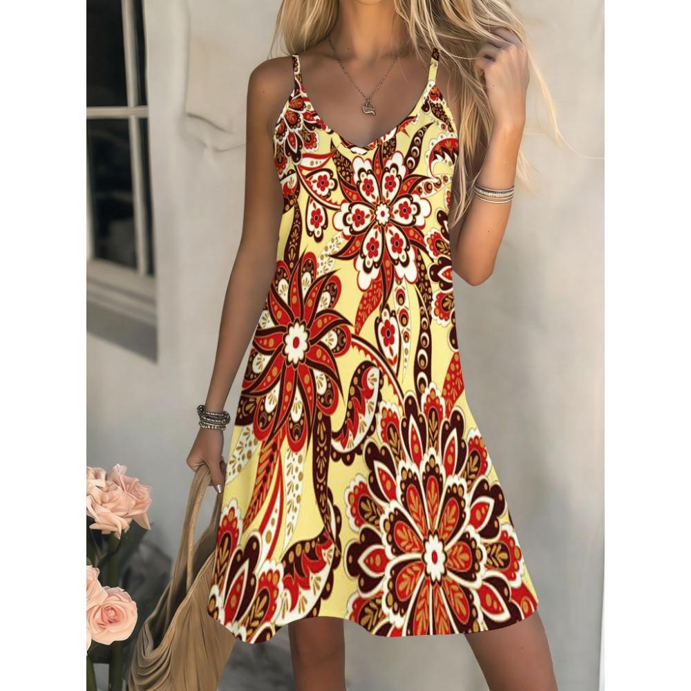 Robe midi décontractée style bohème pour femme, été, col en V plongeant, bretelles fines