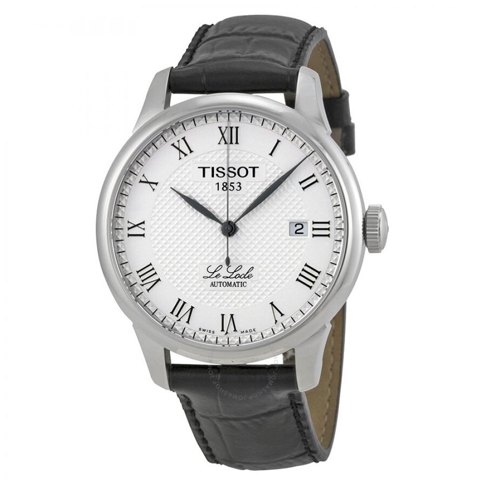 Stainless steel case with a black leather strap. Fixed stainless steel bezel. Silver guilloche dial with silver-tone hands and Roman numeral hour markers. Minute markers around the outer rim. Dial Type: Analog. Date display at the 3 o'clock position. Automatic movement with a 38-hour power reserve. Scratch resistant sapphire crystal. Pull / push crown. Skeleton case back. Case diameter: 39 mm. Case thickness: 9.1 mm. Round case shape. Deployment clasp with a push button release. Water resistant at 30 meters (100 feet). Functions: date, hour, minute, second. Luxury watch style. Watch label: Swiss made. Item Variations: T41142333. Tissot T-Classic Le Locle Silver Dial Black Leather Men's Watch T41.1.423.33