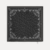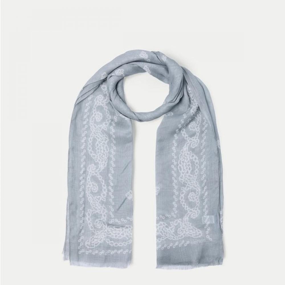 The [series;] mid-length bandana pattern muffler is characterized by a gray base with a sophisticated bandana pattern. Made of soft taion material, it is lightweight and comfortable to wear, and its fringe finish adds elegance. It can be styled in various ways, making it an item to complete a chic look.