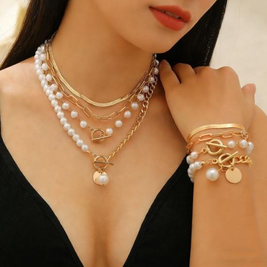 Design Polyvalent à Multiples Chaînes Avec Accents de Perles Imitation: Cet ensemble d'accessoires mélange de manière unique des styles de chaînes classiques, notamment les mailles serpent, les fermoirs OT et les chaînes cubaines, rehaussé par des perles d'imitation chaudes.. La combinaison crée un look équilibré, à la fois doux et audacieux, ce qui la rend parfaite pour diverses occasions telles que le trajet au travail, les rendez-vous décontractés ou les fêtes festives.. Son style adaptable complète une large gamme de tenues sans effort.