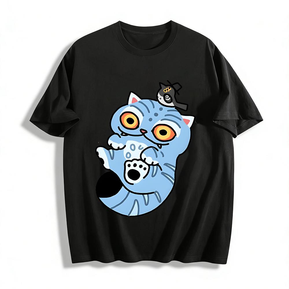 Funny Blue Cat & Top Hat Bird Print Casual T-Shirt Unisex Cartoon Pattern Daily Wear Tee Pure cotton T-shirt