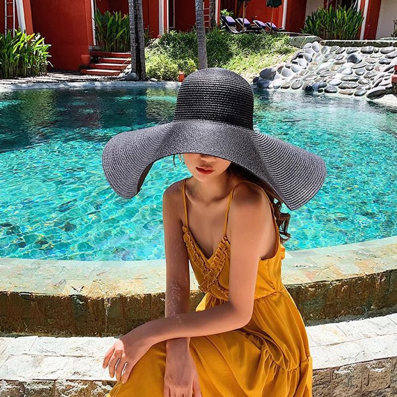 Chapeau à très large bord pour femmes, protection solaire, chapeau de plage en paille, chapeau de soleil de voyage, été au bord de la mer, grand bord 20 cm