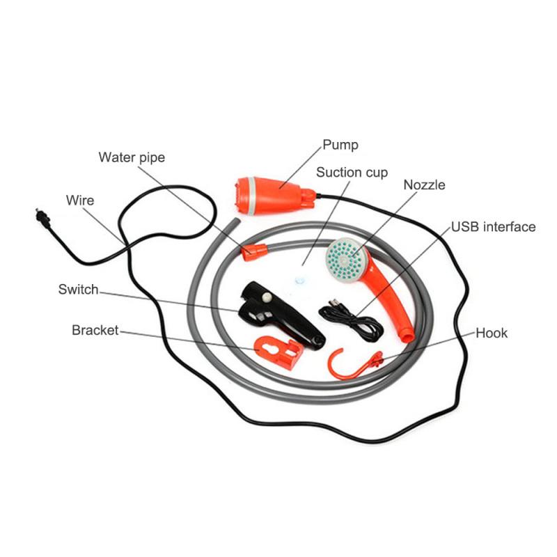 Kit de douche portable d'extérieur pour camping avec débit d'eau de 2,5-3,5 L/min, tuyau de 2 m, chargement USB, autonomie de 30-60 minutes, douche de camping