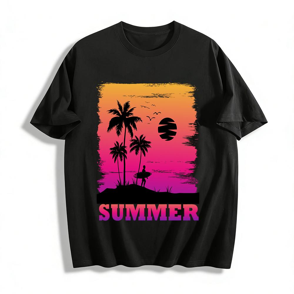 Summer Surf Coconut Tree Sunset Print Casual Short Sleeve T-Shirt Pure cotton T-shirt