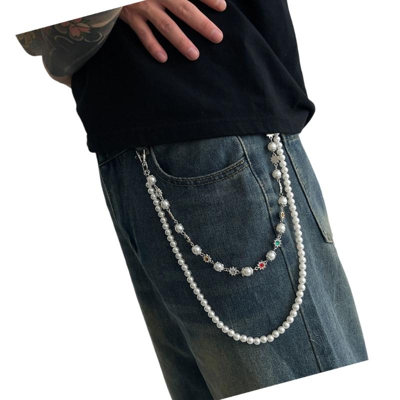Elevating your punk inspired look with this layered wallet chain, rhinestones embellished floral motifs and pearl accents, designed as a unisex jewelry accessory for jeans and trousers.
