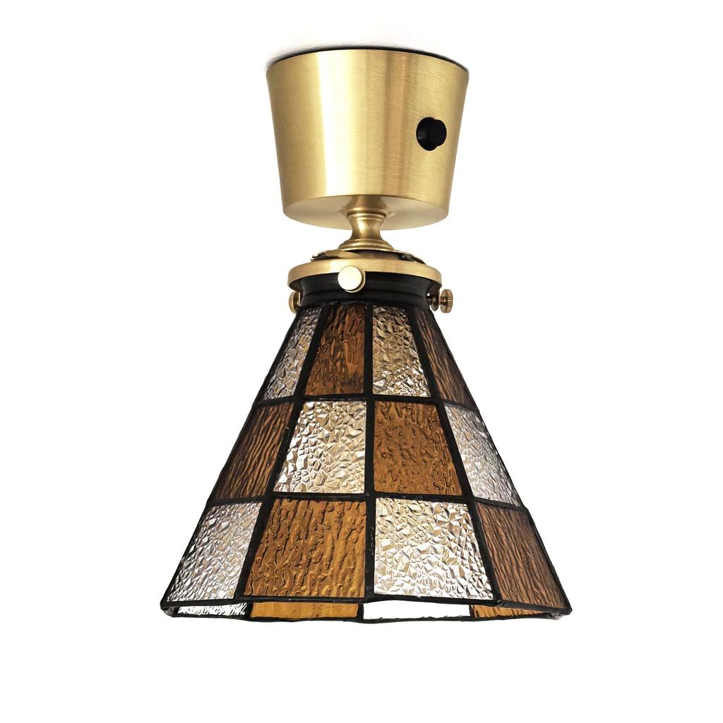 This product is a small ceiling light featuring a conical shade made of colored glass. The rich texture is achieved through stained glass techniques, where each piece of glass is wrapped in copper foil and carefully joined with solder. The combination of clear and brown glass diffuses a warm, soft light when lit, and when switched off, it exudes a calm and sophisticated presence as an interior accent. The glass shade softly diffuses light, making it an ideal design for everyday use such as entrance lights, hallway lights, toilet lights, bathroom lights, and stairwell lights, ensuring sufficient brightness while minimizing glare. It also creates a modern and tranquil atmosphere as a kitchen or dining light. The metal parts are made of high-quality brass. Brass deepens in color over time, developing an antique-like patina. It blends naturally with various interior styles, including Scandinavian, natural, retro modern, and industrial, and is particularly popular among those seeking stylish lighting. The socket is the E14 type, the most commonly used in Japanese households. It supports a wide range of bulbs, including LED bulbs, incandescent bulbs, and Edison bulbs, so it can be used for various purposes and preferences.